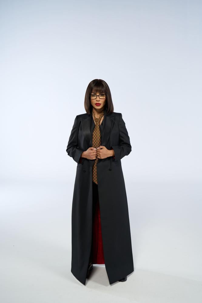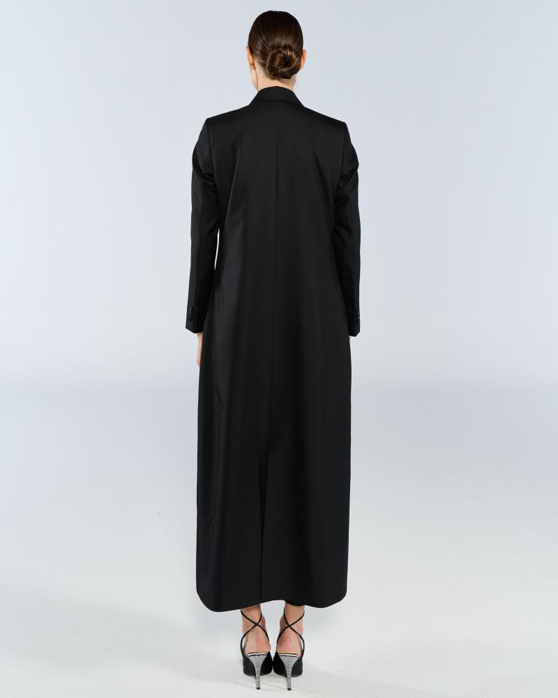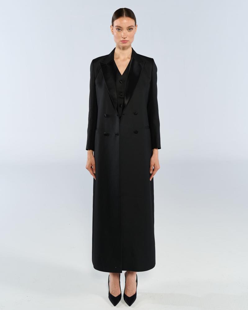 Black double-breasted abaya with satin lapels, matching vest, and bold red lining
